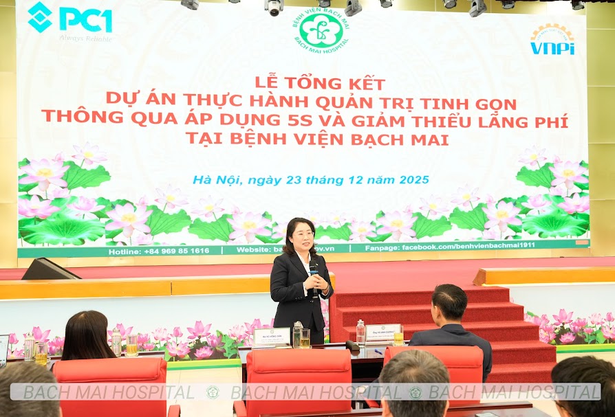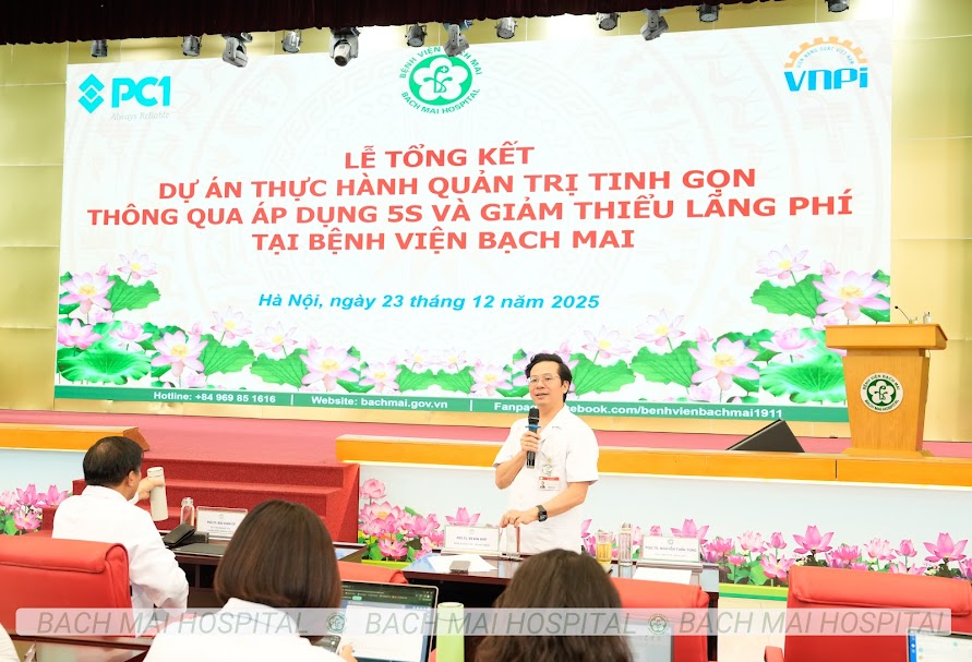 Định hướng trên được PGS.TS Đào Xuân Cơ – Giám đốc Bệnh viện Bạch Mai nhấn mạnh tại Lễ tổng kết Dự án thực hành quản trị tinh gọn thông qua áp dụng 5S và giảm thiểu lãng phí tại Bệnh viện Bạch Mai diễn ra ngày 23/12/2025. Chương trình có sự tham dự của Ban Giám đốc bệnh viện; đại diện đơn vị đồng hành – Tập đoàn PC1; các giảng viên, chuyên gia Viện Năng suất Việt Nam, trong đó có TS. Vũ Hồng Dân; cùng lãnh đạo nhiều khoa, phòng, trung tâm trong toàn viện.