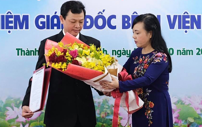 Bác sĩ Thức (bên trái) nhận quyết định bổ nhiệm giám đốc và hoa chúc mừng từ Bộ trưởng Y tế Nguyễn Thị Kim Tiến chiều 11/10. Ảnh: Thiên Chương.