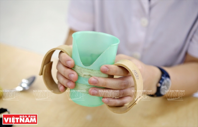 Chiếc cốc được thiết kế đặc biệt để giúp bệnh nhân tìm lại cảm giác cầm cốc và đưa lên miệng uống.