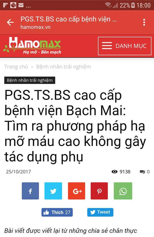 Vừa qua trên trang mạng xã hội đã đăng bài viết với tiêu đề: “PGS.TS.BS cao cấp bệnh viện Bạch Mai: Tìm ra phương pháp hạ mỡ máu cao không gây tác dụng phụ”.