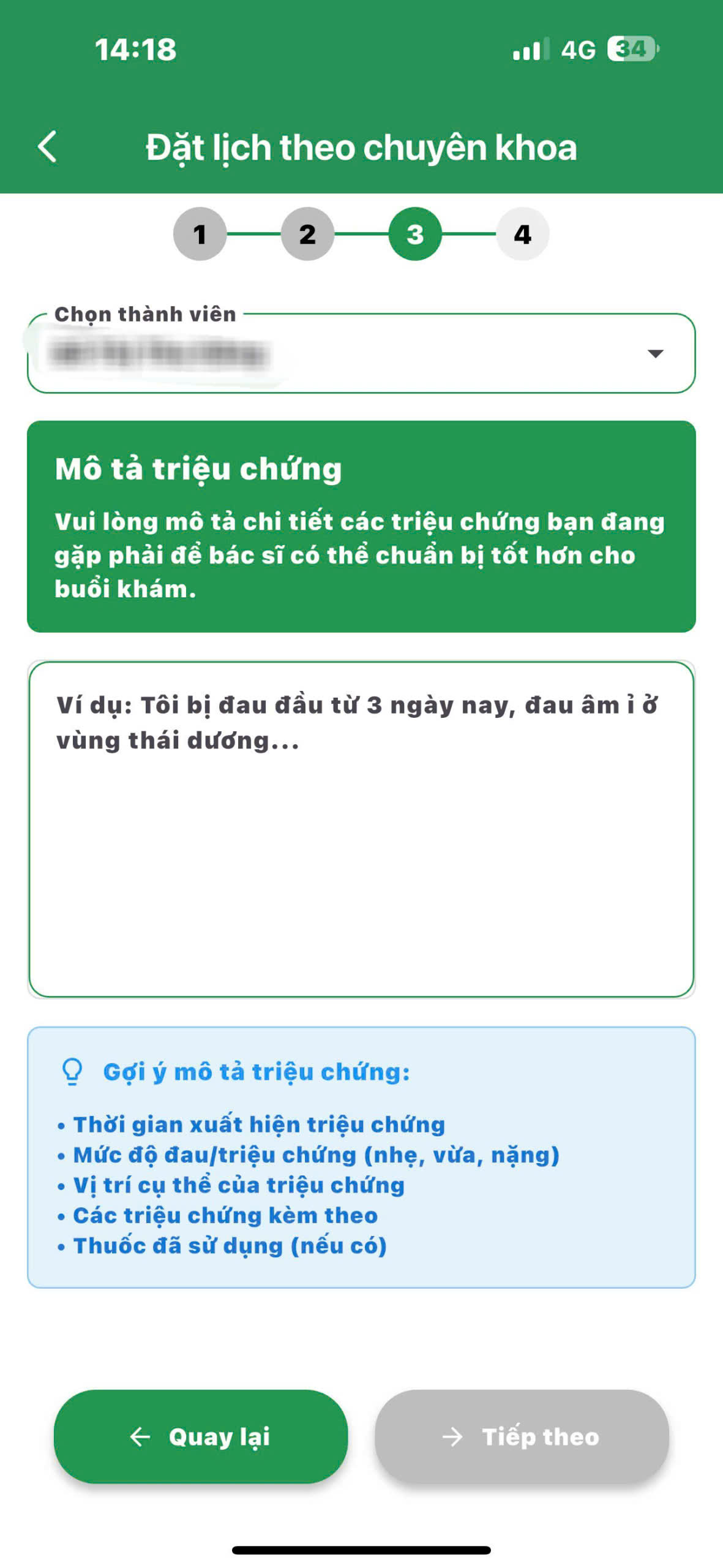 Bước 2. MÔ TẢ TRIỆU CHỨNG & CHỌN THỜI GIAN