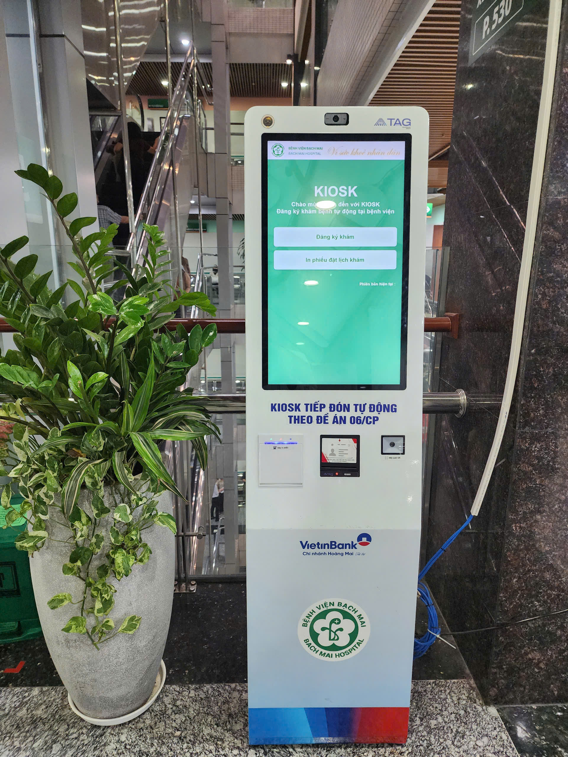 Ø Quét mã Kiosk: Đến viện, tiến thẳng tới cây Kiosk (có biển mica “NƠI IN PHIẾU”), quét mã QR trên App để nhận phiếu vào thẳng phòng khám mà không cần xếp hàng đăng ký trực tiếp.