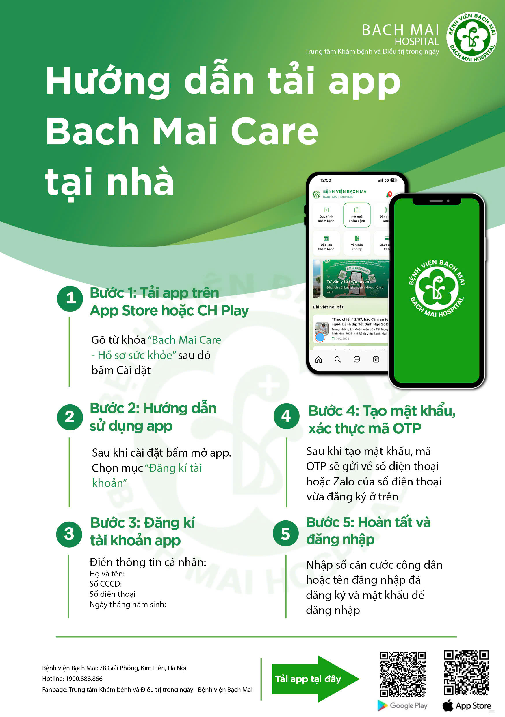 1. Tải ứng dụng: Tìm kiếm “Bạch Mai Care – Hồ sơ sức khỏe” trên App Store hoặc Google Play.