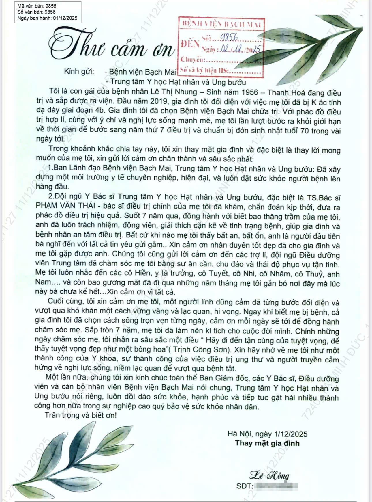 Bệnh viện Bạch Mai trân trọng và biết ơn những tình cảm quý báu mà người bệnh và gia đình đã gửi gắm. Đó chính là nguồn động lực lớn lao để tập thể y bác sĩ tiếp tục giữ vững “tâm vững – trí an”, bền bỉ trên hành trình chăm sóc và bảo vệ sức khỏe nhân dân.