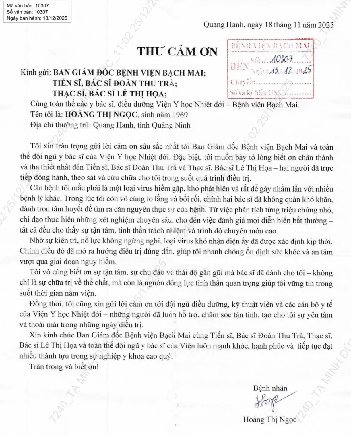 Trong lá thư gửi bệnh viện, bệnh nhân xúc động viết: “Trong lúc tôi vô cùng lo lắng và bối rối, chính hai bác sĩ đã không quản khó khăn, dành trọn tâm huyết để tìm ra căn nguyên thực sự của bệnh. Sự tận tâm ấy không chỉ cứu tôi về thể chất mà còn là nguồn động lực tinh thần lớn lao trong suốt thời gian nằm viện”.