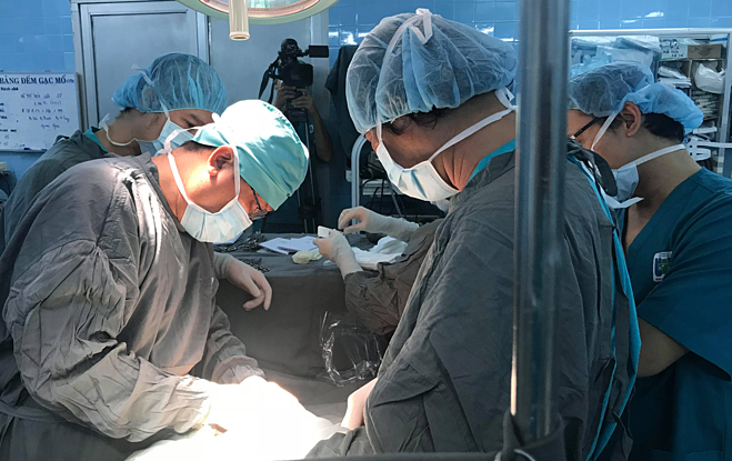 Bác sĩ Tiến cùng đồng nghiệp thực hiện phẫu thuật. Ảnh bệnh viện cung cấp. |