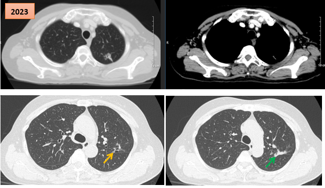 Hình ảnh cắt lớp vi tính theo dõi trong quá trình điều trị, tổn thương xơ hóa tại vị trí u cũ (mũi tên xanh) và giãn khu trú các nhánh phế quản liền kề (mũi tên vàng)