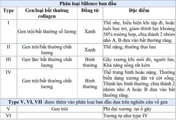Dựa trên các dấu hiệu lâm sàng, phân loại OI đầu tiên của David Sillence năm 1979. Tác giả này chia bệnh thành bốn loại (loại I đến IV). Phần lớn các trường hợp OI ( 85-90 %) là do đột biến gen mã hõa collagen type I. Phân loại này đã được sử dụng phổi biến; theo thời gian đã bổ sung 4 loại mới (loại V đến VIII). Thậm chí hiện nay phân loại này được bổ xung đến loại XV [2], [3]