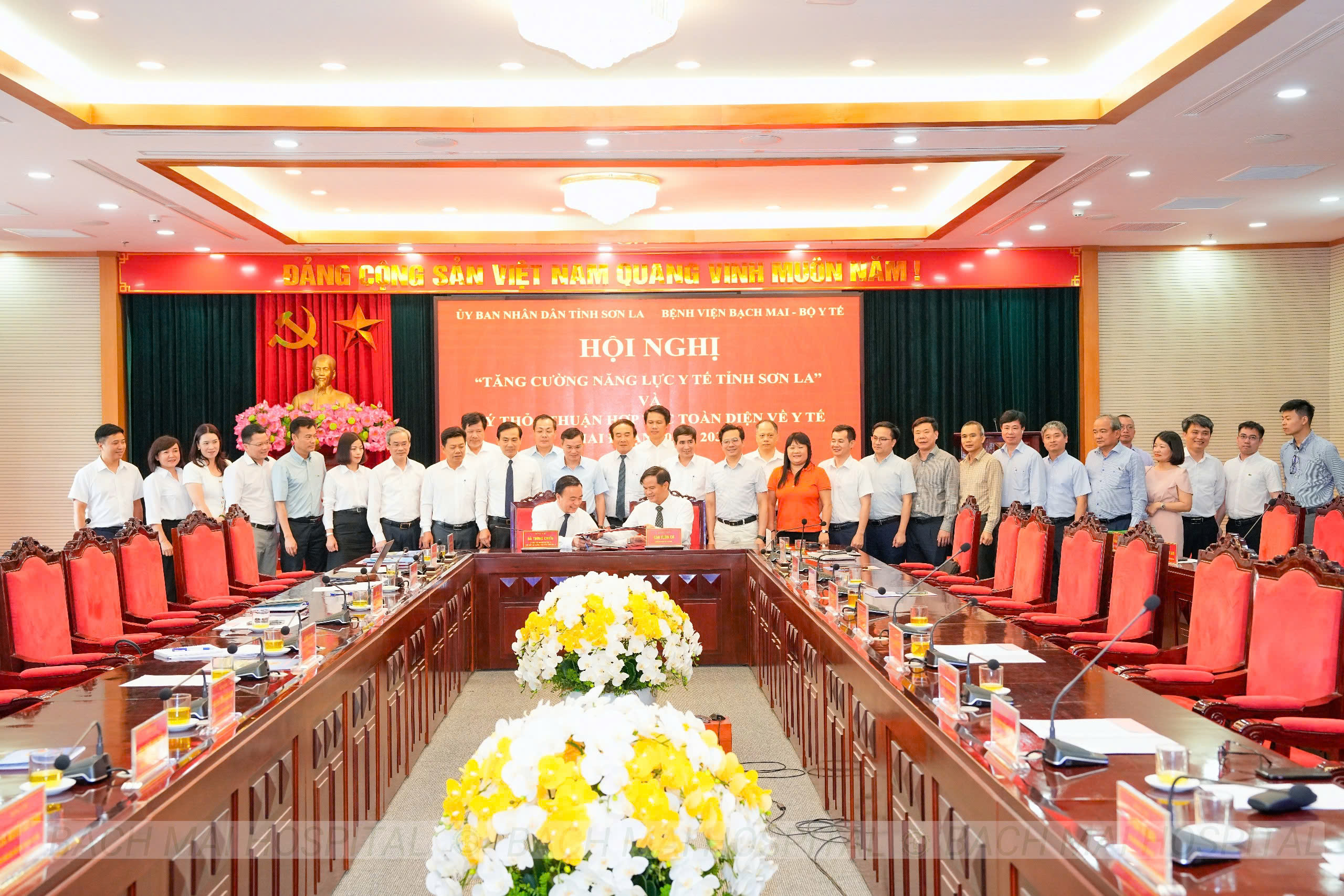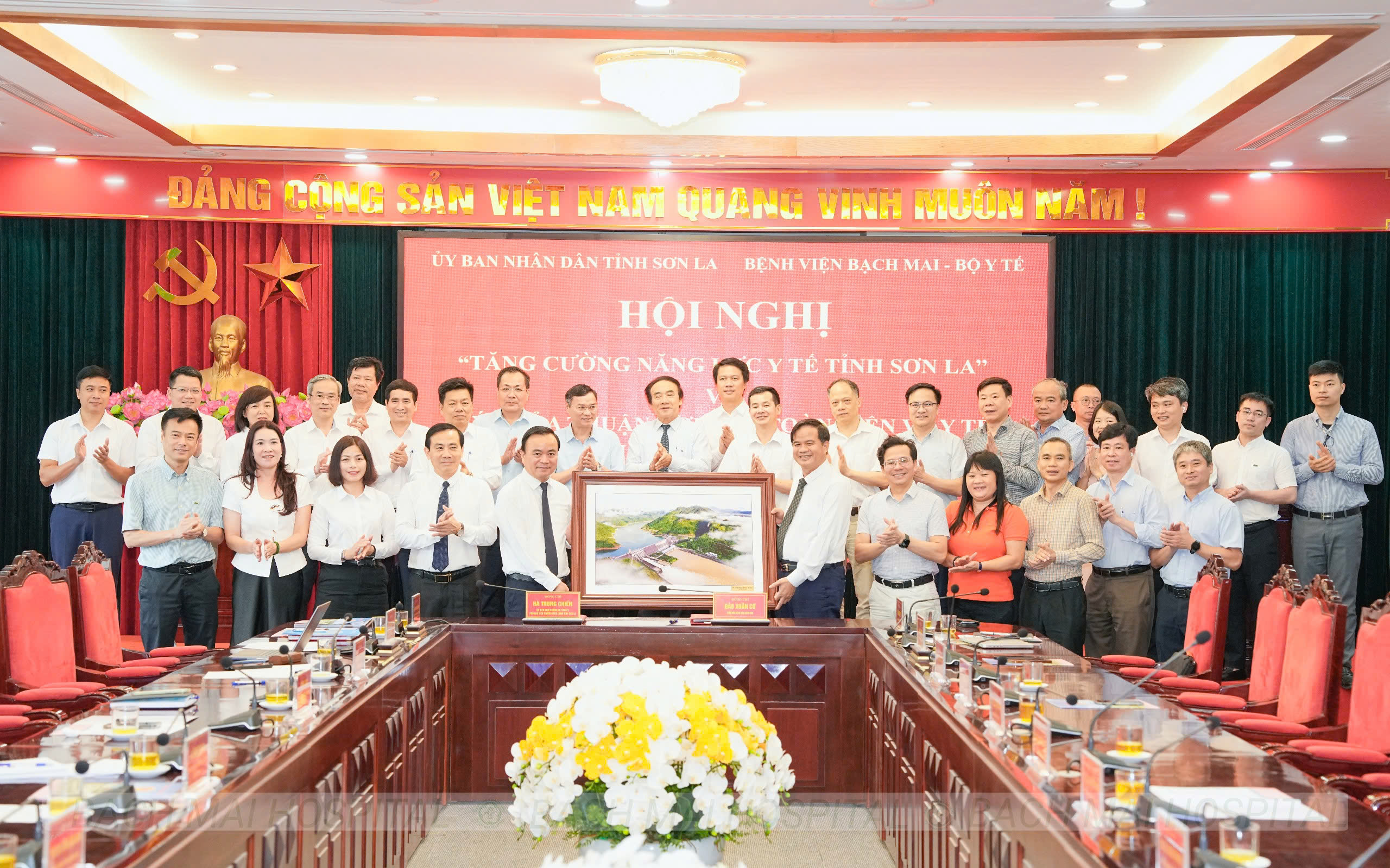 PGS.TS Đào Xuân Cơ, Giám đốc Bệnh viện Bạch Mai và ông Hà Trung Chiến, Phó Chủ tịch Thường trực UBND tỉnh Sơn La đồng chủ trì với sự tham dự của lãnh đạo các sở, ngành, đơn vị y tế trong tỉnh và đoàn chuyên gia đầu ngành của Bệnh viện Bạch Mai.