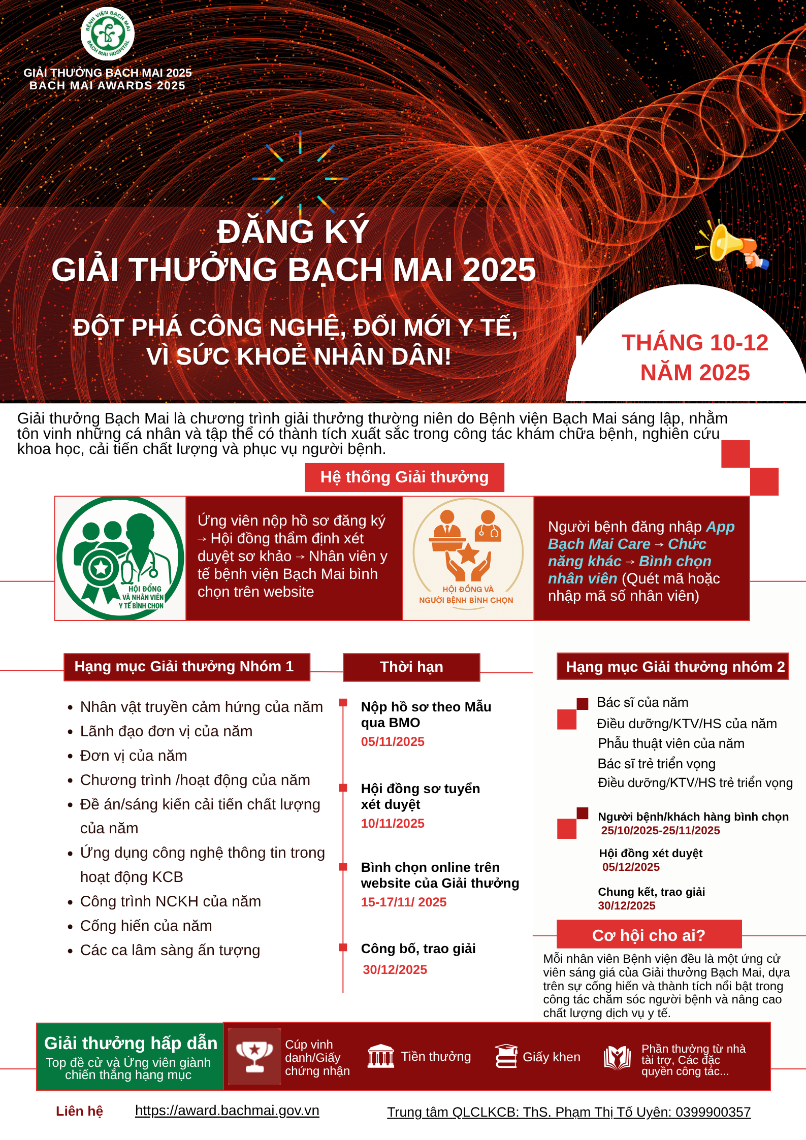 Theo PGS.TS Đào Xuân Cơ – Giám đốc Bệnh viện Bạch Mai, Giải thưởng Bạch Mai là một trong những chương trình trọng điểm của bệnh viện trong năm 2025. “Chúng tôi mong muốn qua giải thưởng này, mỗi cán bộ y tế sẽ được ghi nhận đúng mức, khuyến khích sự sáng tạo, đổi mới và nỗ lực không ngừng vì người bệnh. Đây cũng là bước đi quan trọng để phát triển văn hóa thi đua, lan tỏa hình ảnh đẹp của Bệnh viện Bạch Mai – nơi hội tụ trí tuệ, nhân ái và trách nhiệm xã hội”, PGS.TS Đào Xuân Cơ nhấn mạnh.