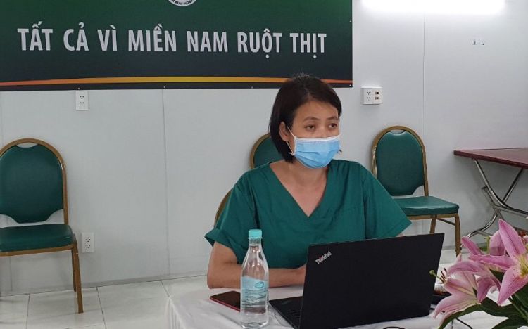Bác sĩ Anh Thư trao đổi quy trình làm việc với các bệnh viện dã chiến triển khai công tác kiểm soát nhiễm khuẩn.