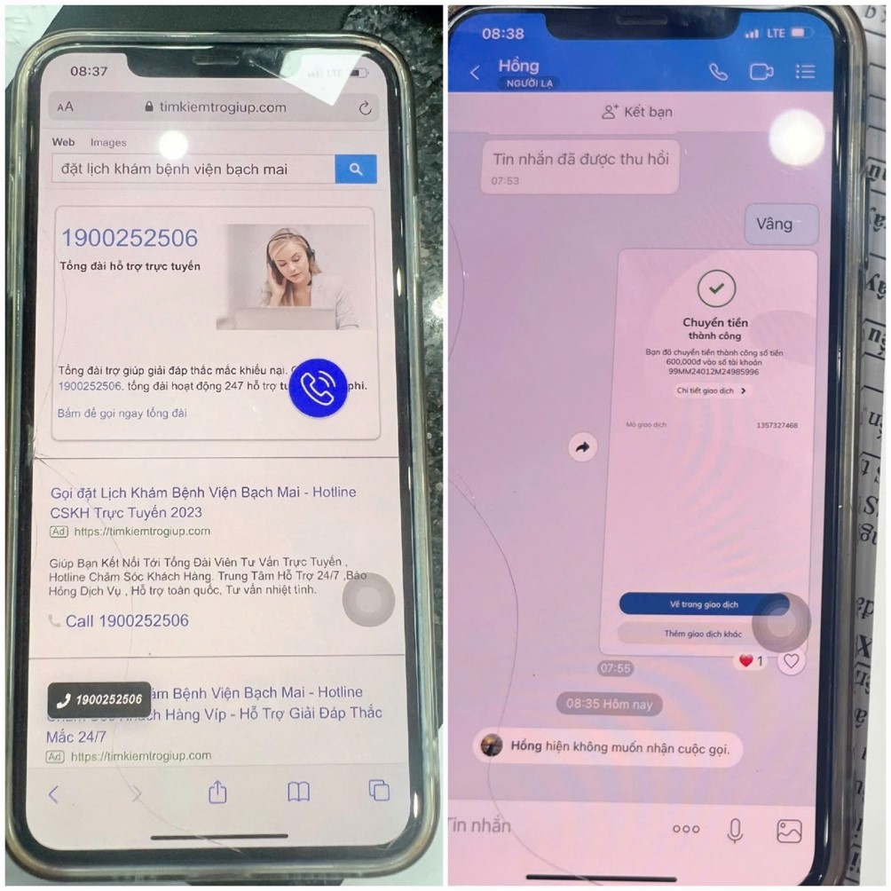 Cụ thể, khách hàng cho biết, quá trình tìm kiếm thông tin trên mạng bằng điện thoại có nhìn thấy quảng cáo về việc đặt lịch đi khám nên ấn vào thì hiện ra trang web: https://timkiemtrogiup.com/. Sau đó, khách hàng đánh trường thông tin vào ô tìm kiếm “đặt lịch khám bệnh viện bạch mai” thì hiện ra số điện thoại tổng đài và ấn gọi. Khi nói chuyện với “tổng đài viên”, đề xuất về nhu cầu muốn đặt lịch khám cho con tại Bệnh viện Bạch Mai thì được hướng dẫn sẽ có nhân viên kết bạn zalo gửi tin nhắn xác nhận. Tiếp đó, khách hàng nhận được mã QR code số tài khoản yêu cầu chuyển khoản tiền đặt lịch khám là 600.000đ (Sáu trăm nghìn đồng).