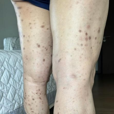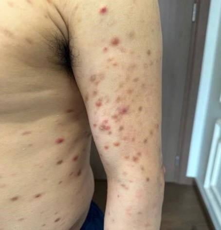 Bệnh nhân B.Đ.X, 54 tuổi, đến khám tại Trung tâm Huyết học và Truyền máu – Bệnh viện Bạch Mai trong tình trạng có các nốt sẩn nhỏ, hơi gồ trên da, xuất hiện đầu tiên ở vùng lưng rồi lan dần ra bụng, ngực, tay, chân. Một số nốt có dấu hiệu hoại tử nhẹ, đóng vảy đen, để lại sẹo thâm, teo nhỏ.