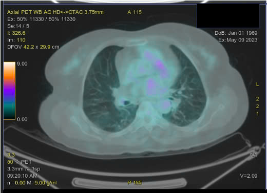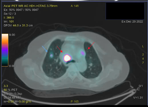 – Hình ảnh nốt tổn thương phổi phải, tổn thương xương bướm, tăng chuyển hóa FDG hướng tới ác tính.