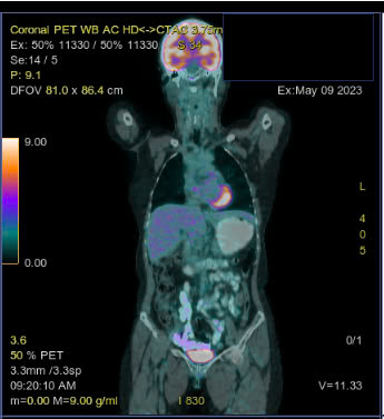 Sau điều trị 4 chu kỳ, bệnh nhân được chụp PET/CT đánh giá đáp ứng điều trị: