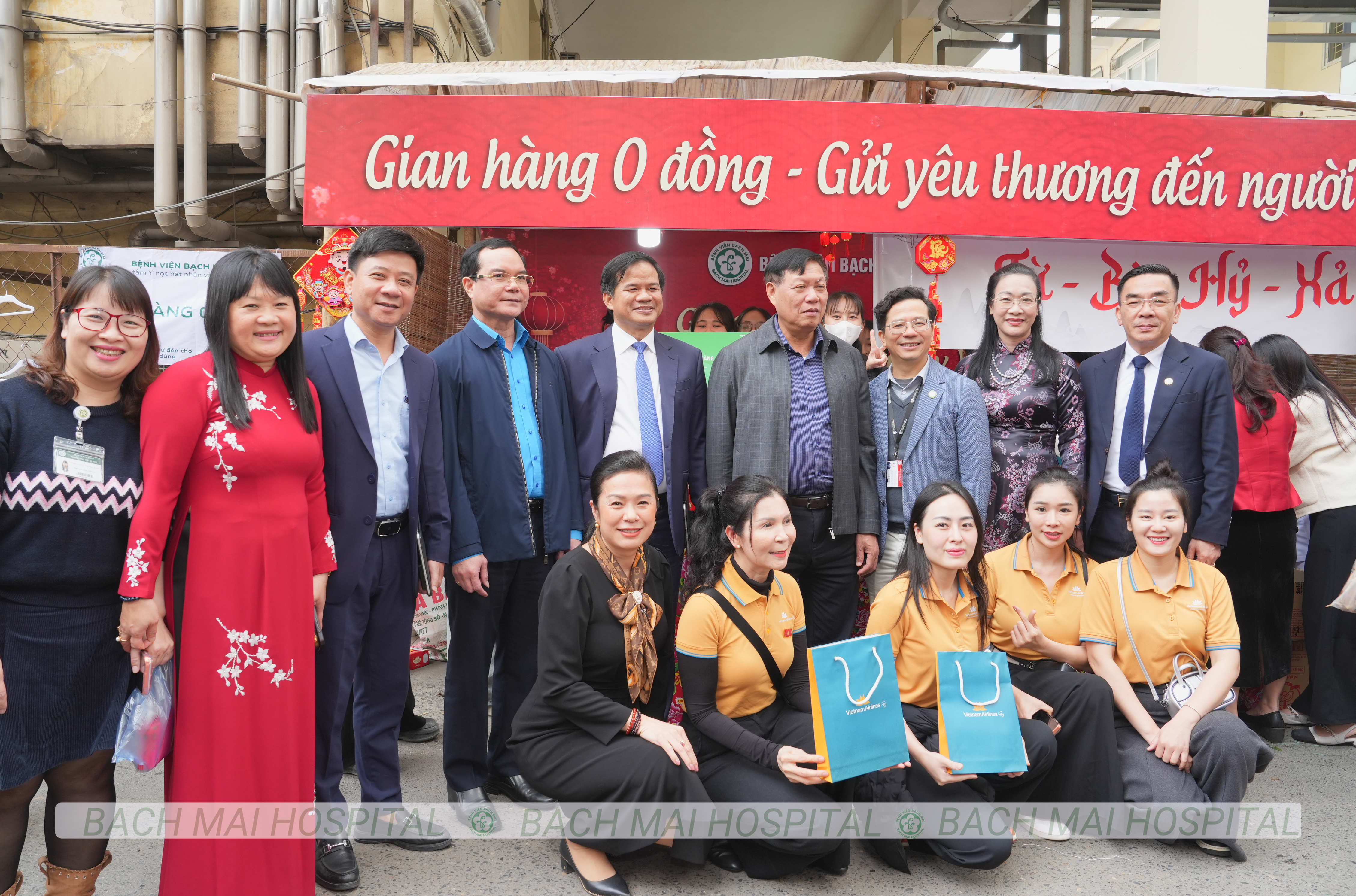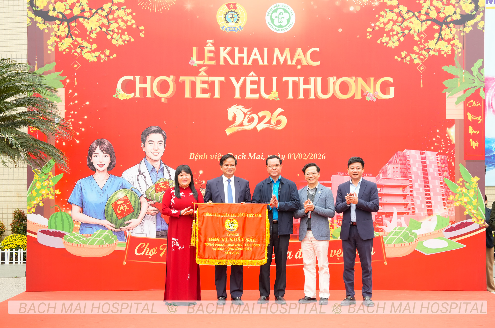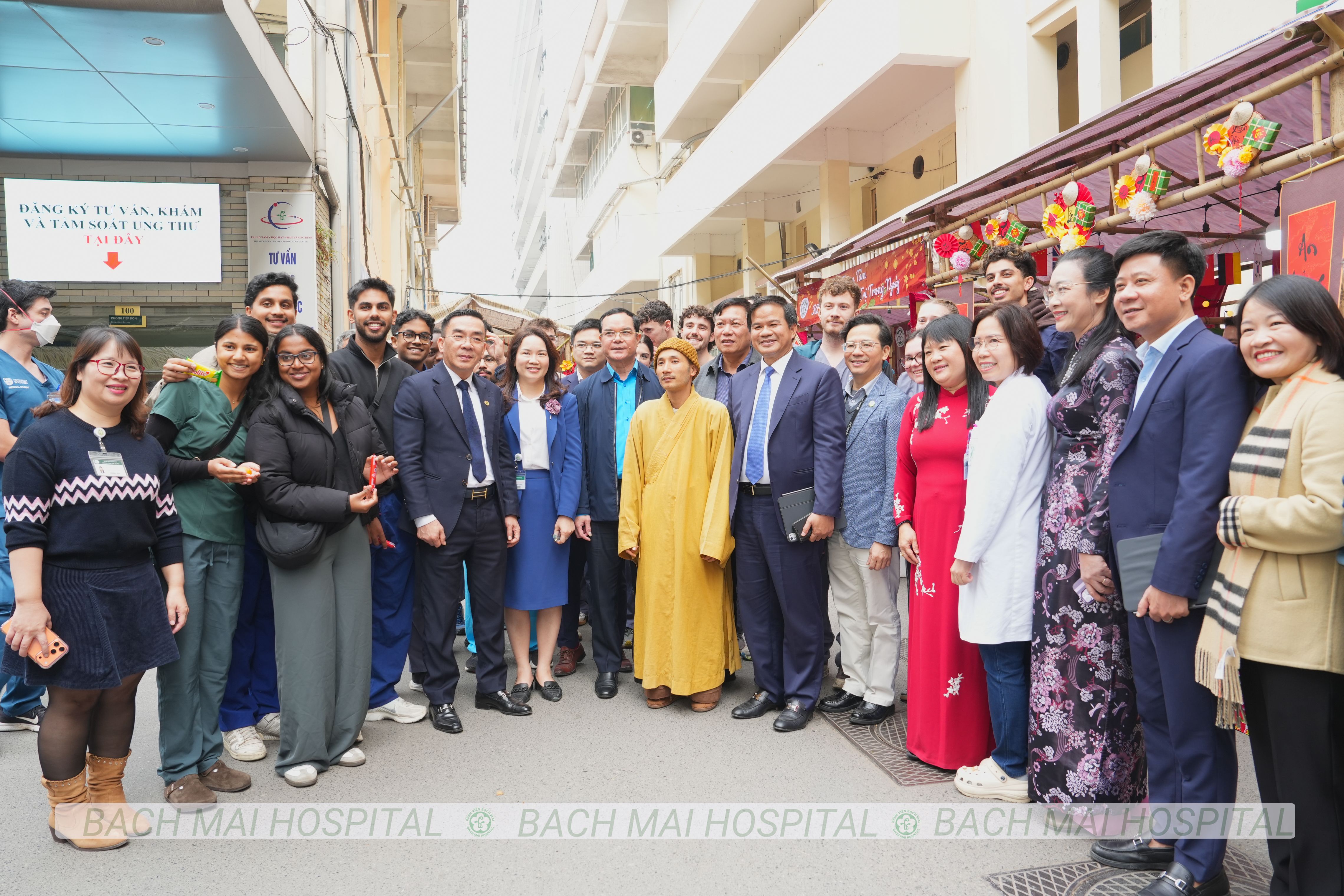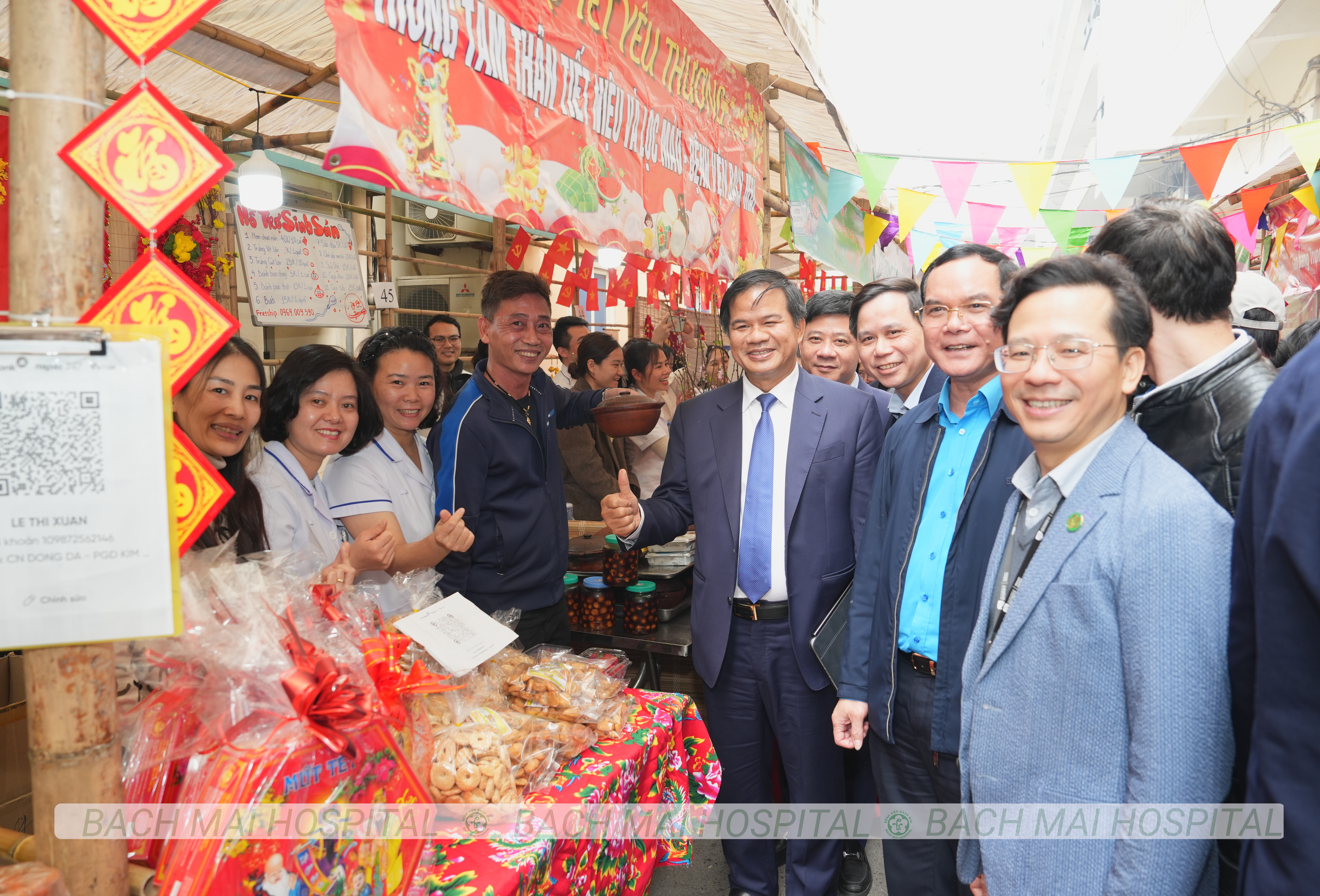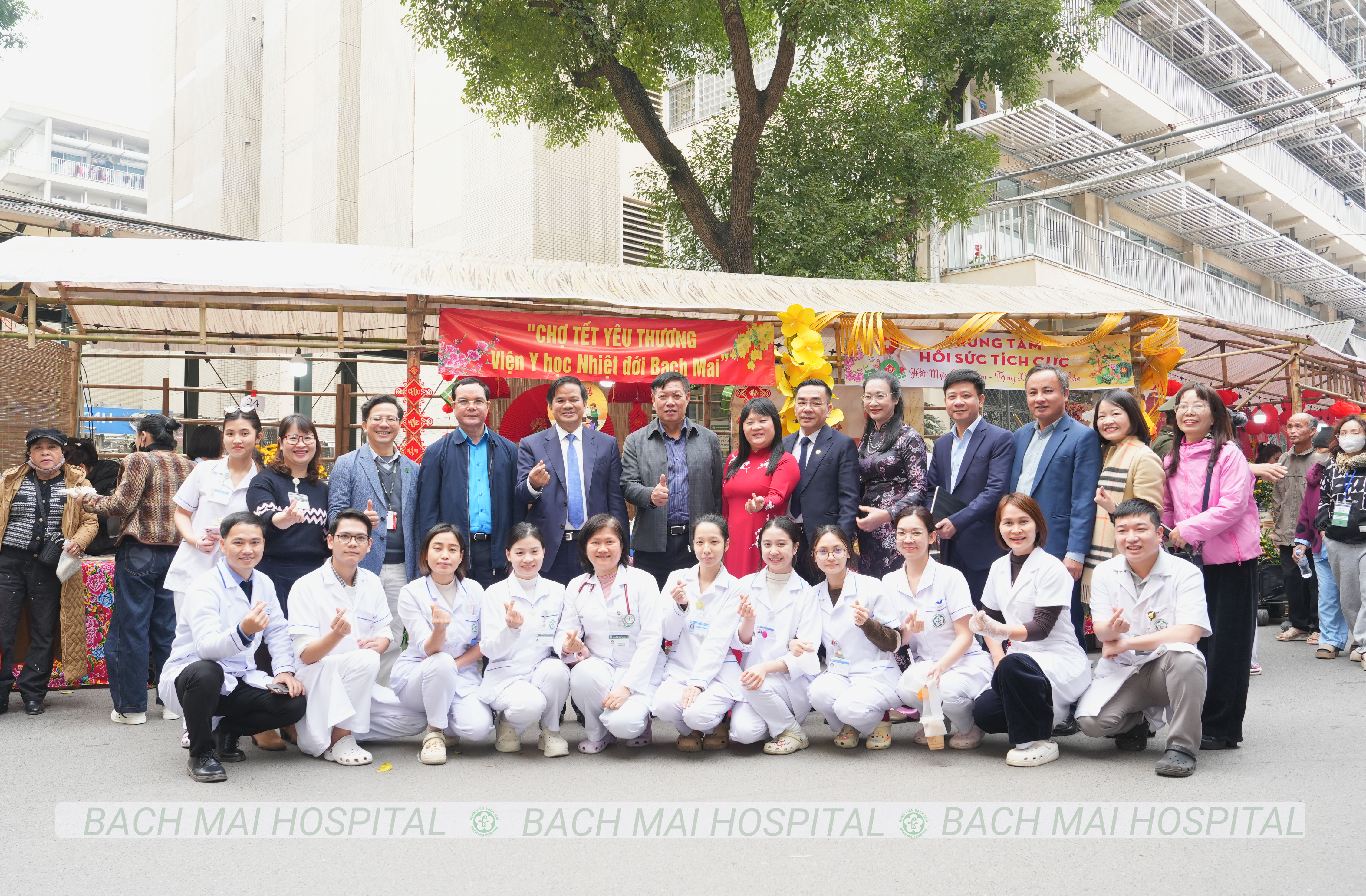 Các đồng chí lãnh đạo cắt băng khai trương và chụp ảnh lưu niệm cùng nhân viên y tế tại Chợ Tết yêu thương Bệnh viện Bạch Mai 2026