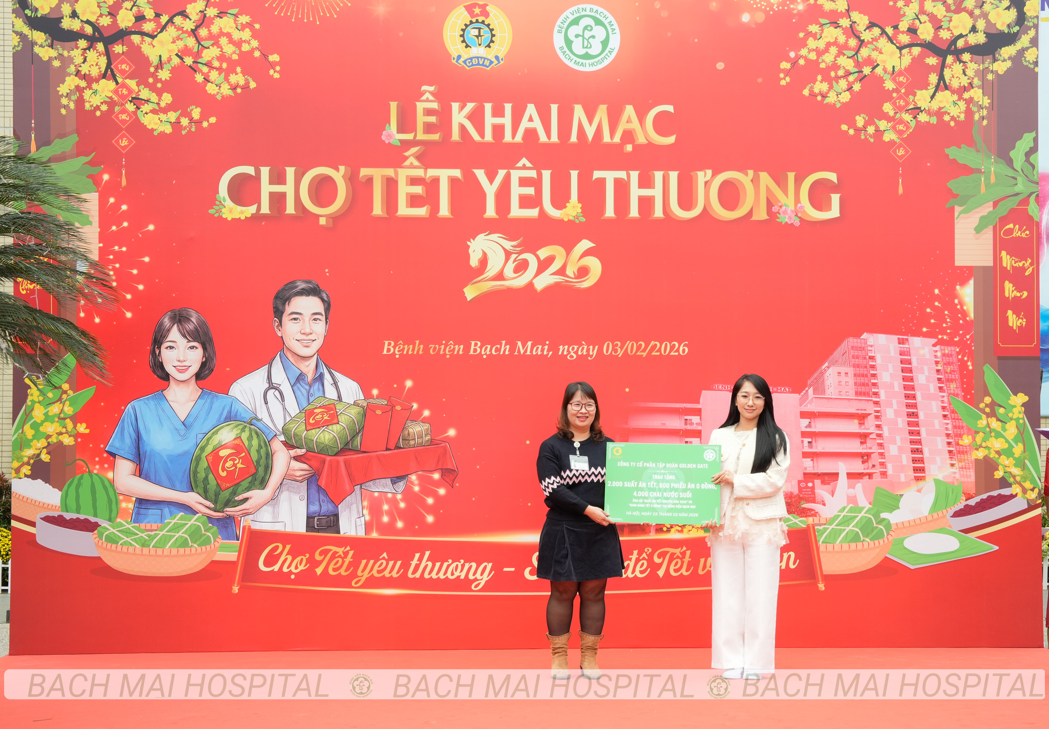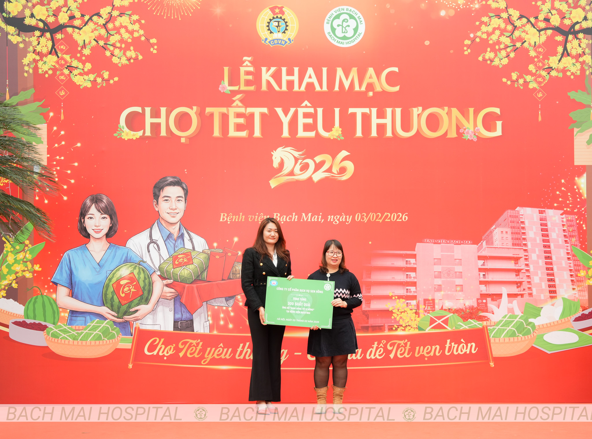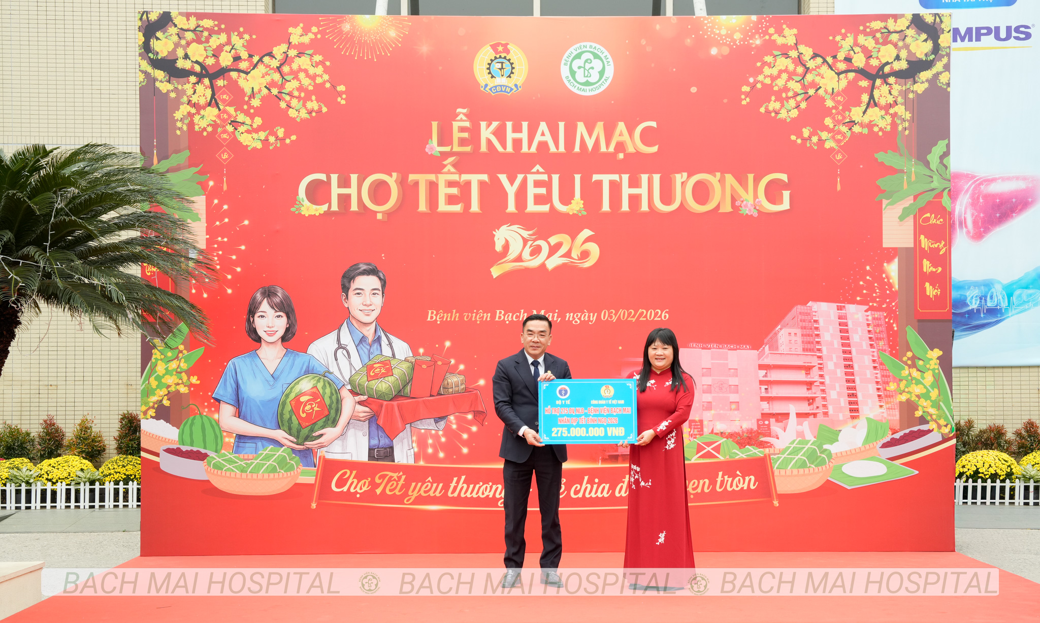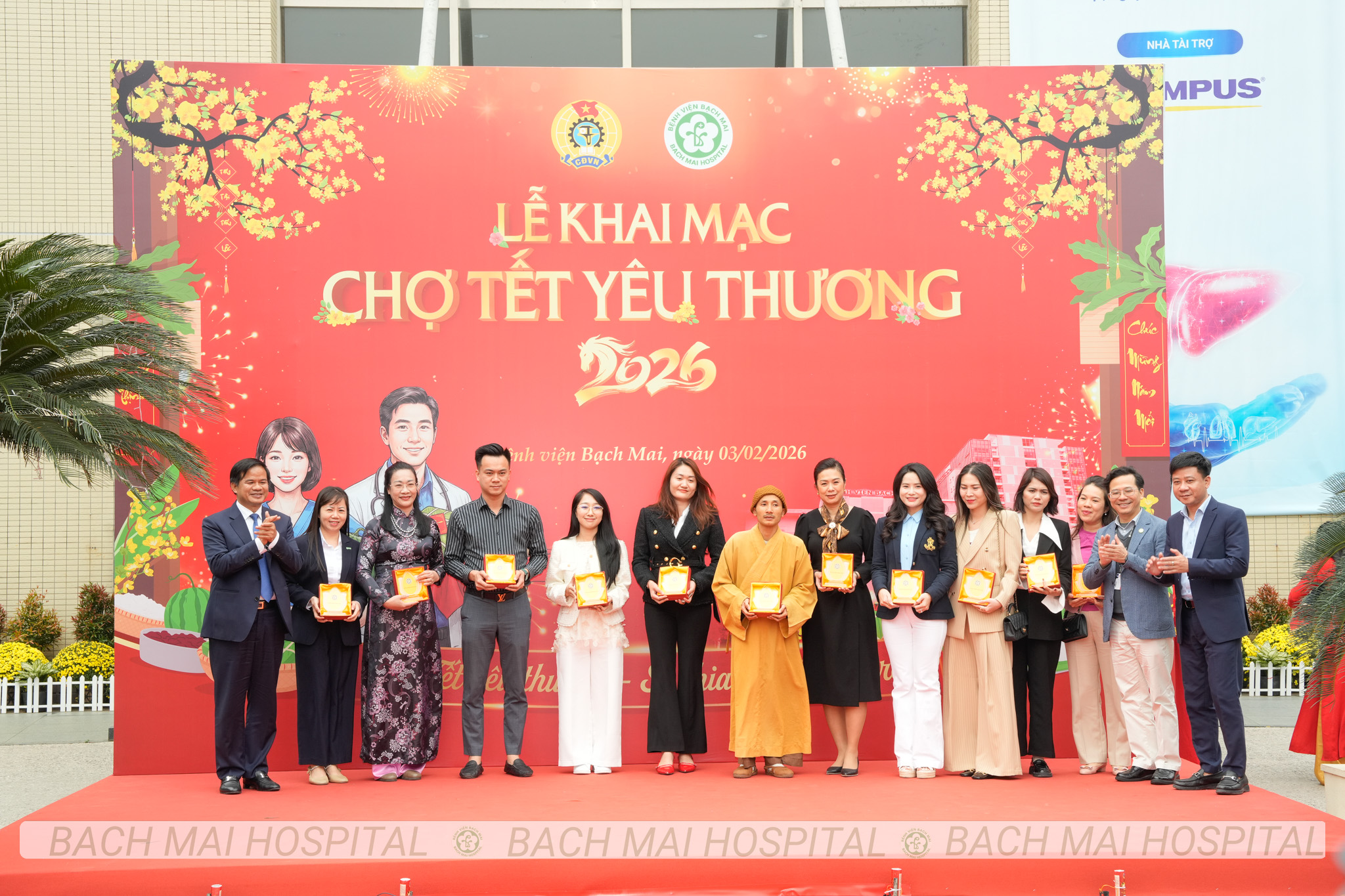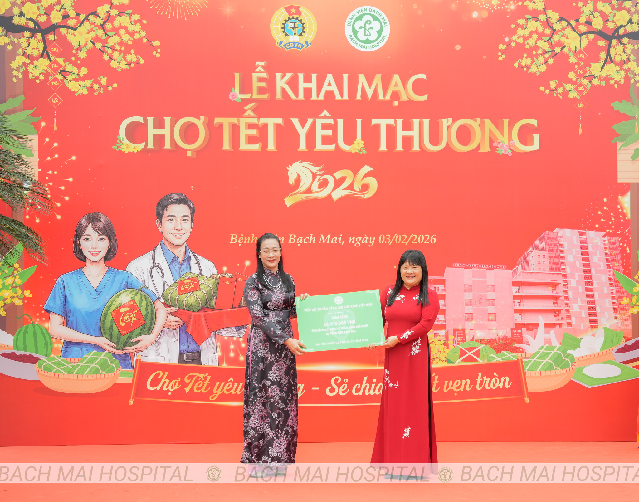 Các đồng chí lãnh đạo cắt băng khai trương và chụp ảnh lưu niệm cùng nhân viên y tế tại Chợ Tết yêu thương Bệnh viện Bạch Mai 2026