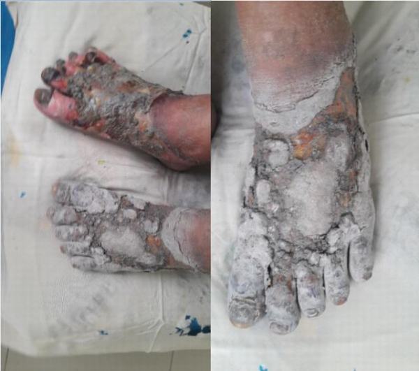 Bệnh nhân bị hoại tử chân do tự ngâm thuốc lá không rõ nguồn gốc.