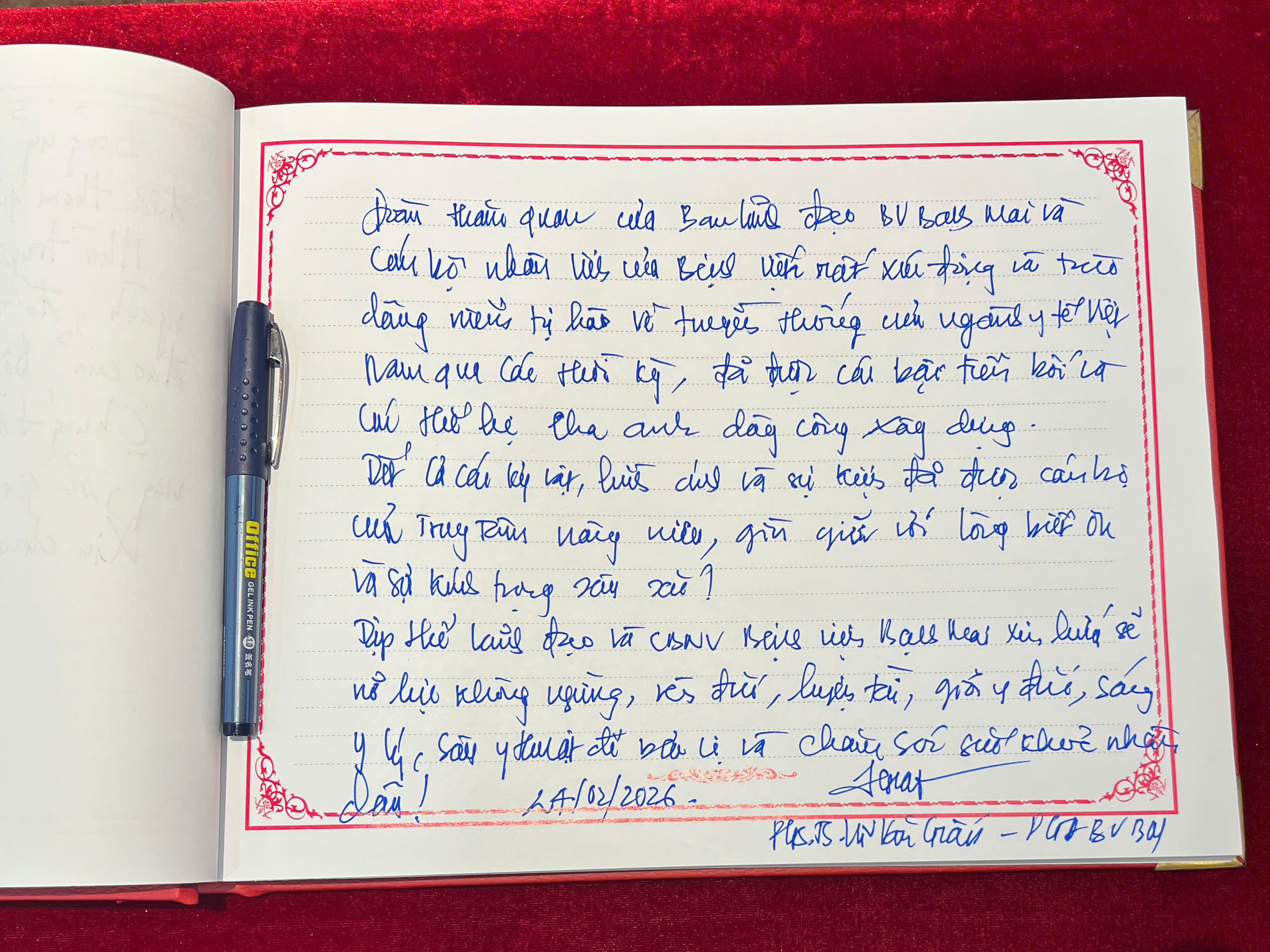 Tại buổi tham quan, PGS.TS Vũ Văn Giáp đã trân trọng ghi vào sổ lưu niệm của Phòng Truyền thống, bày tỏ sự tri ân sâu sắc đối với các thế hệ thầy thuốc đi trước đã dày công vun đắp, xây dựng nền y tế Việt Nam ngày càng phát triển. Đồng chí nhấn mạnh, những tư liệu, hình ảnh được lưu giữ tại đây là nguồn động viên, nhắc nhở mỗi cán bộ y tế hôm nay phải không ngừng rèn luyện chuyên môn, giữ vững y đức, phát huy truyền thống vẻ vang của ngành.