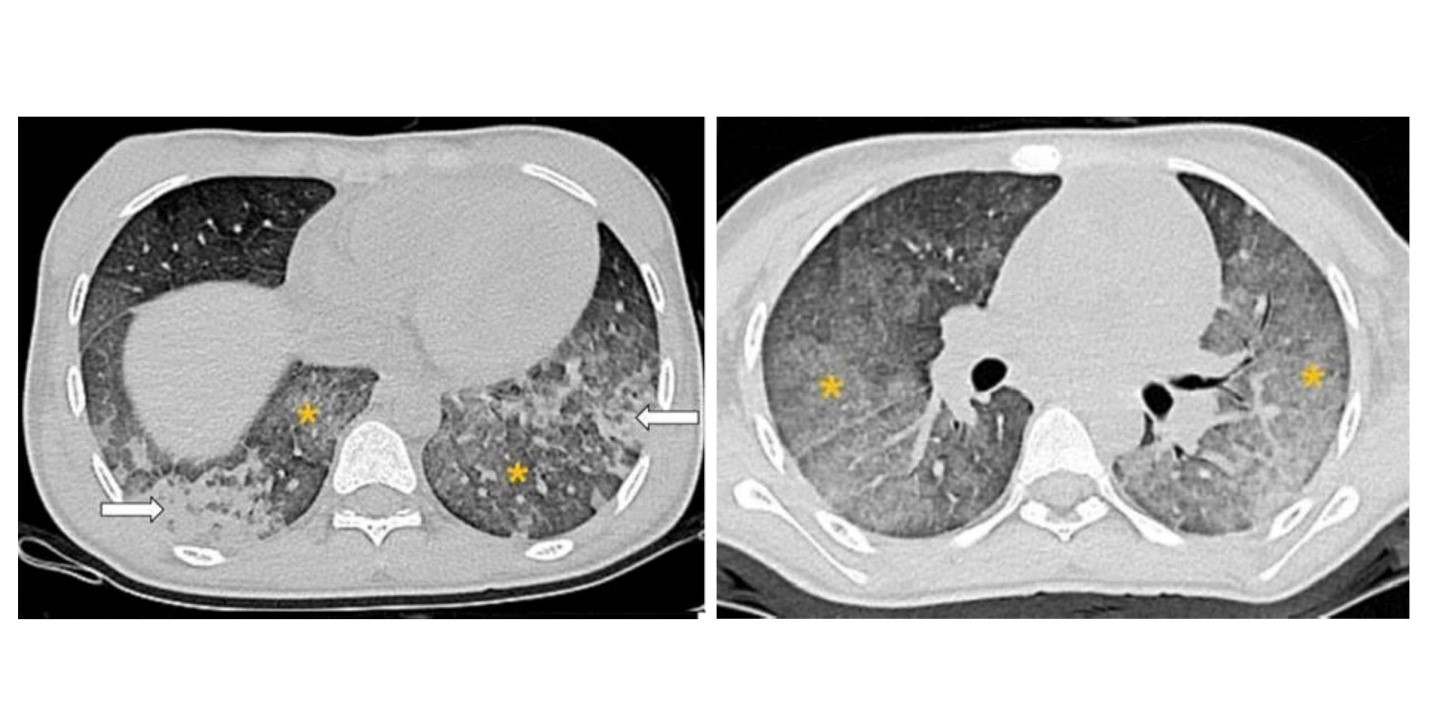 Hình ảnh chụp cắt lớp vi tính lồng ngực cho thấy hình ảnh các tổn thương gợi ý chảy máu phế nang lan tỏa