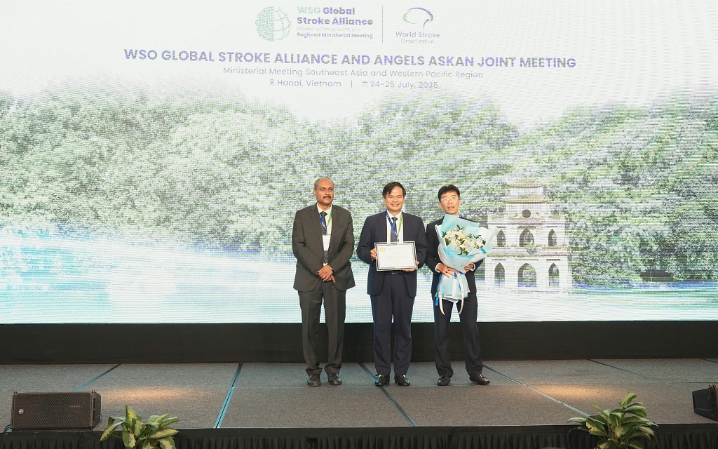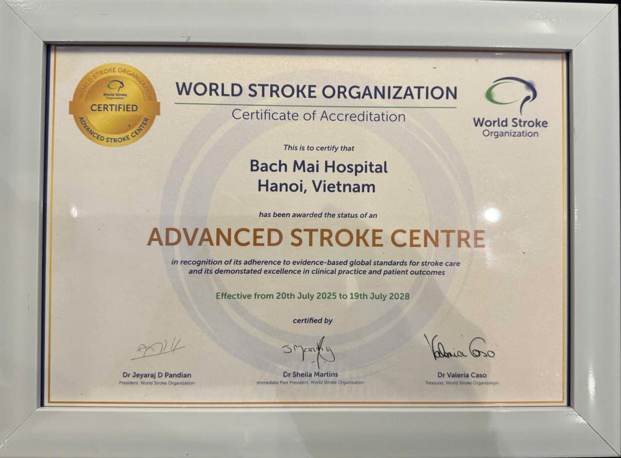 Một trong những dấu mốc quan trọng nhất tại GSA 2025 là việc WSO trao tặng Bệnh viện Bạch Mai chứng nhận “Trung tâm Đột quỵ chuyên sâu (Advanced Stroke Center)”. Đây là lần đầu tiên một bệnh viện của Việt Nam đạt được chứng nhận danh giá này từ WSO, và cũng là bệnh viện đầu tiên tại Đông Nam Á được công nhận theo bộ tiêu chuẩn mới cập nhật với yêu cầu đánh giá khắt khe và toàn diện của WSO. Thành tựu này là sự khẳng định cho nỗ lực không ngừng nghỉ, sự đầu tư bài bản về cơ sở vật chất, trang thiết bị, và đặc biệt là nguồn nhân lực chất lượng cao của Bệnh viện Bạch Mai trong việc chuẩn hóa chất lượng điều trị đột quỵ tại Việt Nam, mang đến cơ hội sống và hồi phục tốt hơn cho người bệnh.