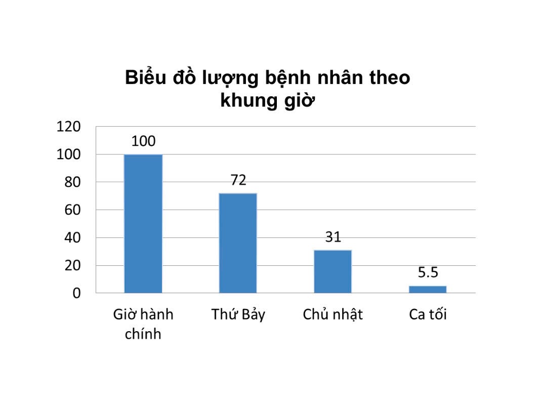– Lượng bệnh nhân khám ngoài giờ (ca tối và cuối tuần) chỉ chiếm 5.5% – 31%, tạo điều kiện thuận lợi để bệnh nhân được thăm khám nhanh chóng, không phải chờ đợi.