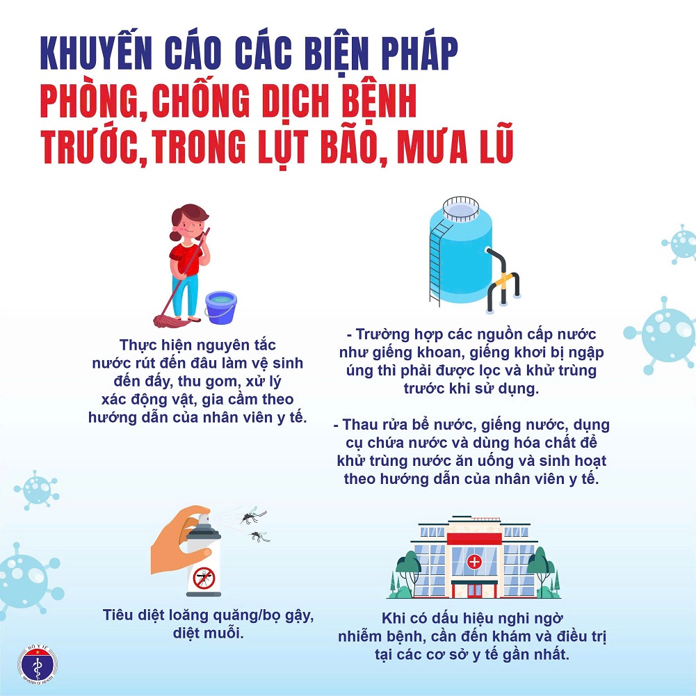 Để chủ động phòng, chống dịch bệnh có nguy cơ xảy ra trong và sau lụt bão, mưa lũ, Bộ Y tế khuyến cáo về biện pháp phòng, chống dịch bệnh trước, trong lụt bão, mưa lũ, cụ thể: