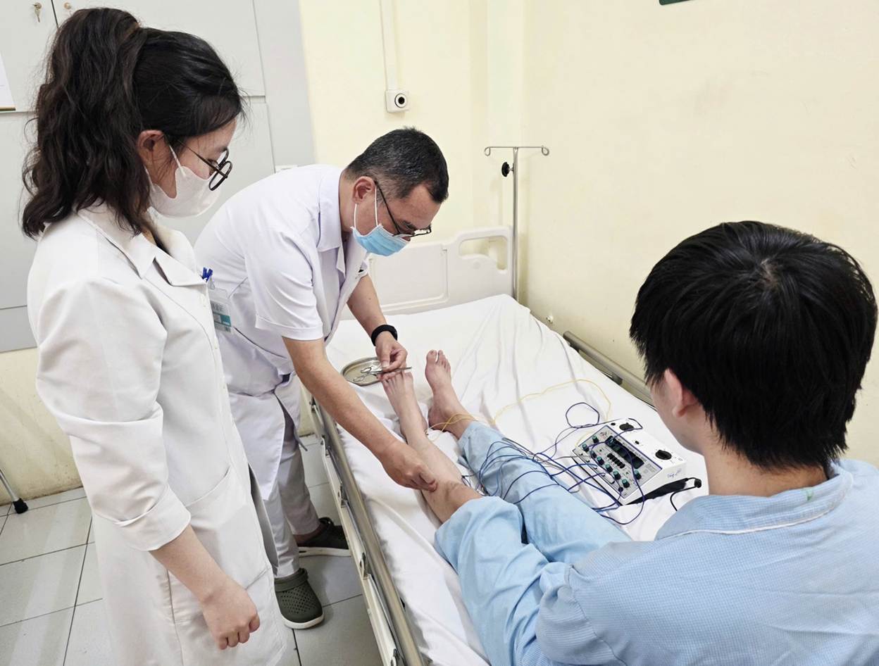 Tại khoa Y học cổ truyền, người bệnh được điều trị theo hướng kết hợp Y học cổ truyền và Y học hiện đại, bao gồm: Sử dụng thuốc chống viêm, bổ sung vitamin nhóm B (B1, B6, B12). Châm cứu, điện châm. Xoa bóp, bấm huyệt vùng cẳng chân. Thuốc y học cổ truyền phù hợp thể trạng. Tập phục hồi chức năng.