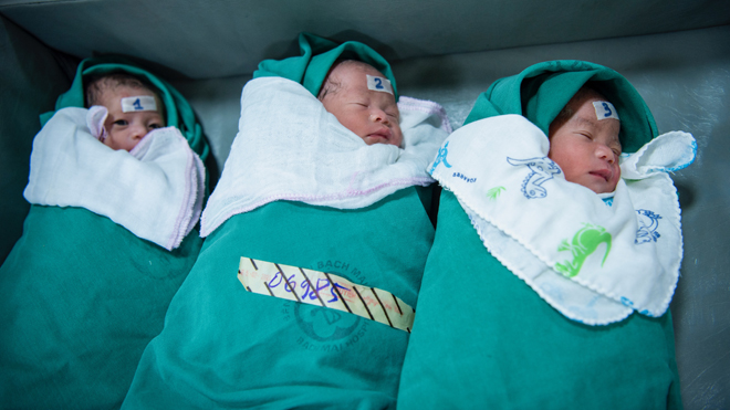 Ba bé sơ sinh gồm hai bé trai, một bé gái chào đời khỏe mạnh. Theo các bác sĩ, khoảng 8.000 ca mới có một trường hợp mang thai 3 tự nhiên.