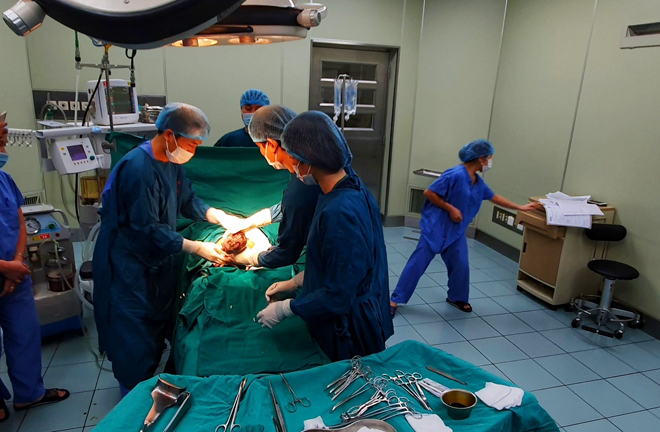 | Các bác sĩ tiến hành ca phẫu thuật ca 3 thai tự nhiên. |