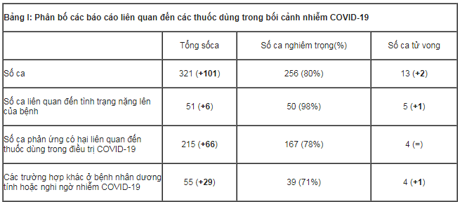 • 215 ca (chiếm 67%) được cho là có liên quan đến các thuốc dùng trong điều trị COVID-19