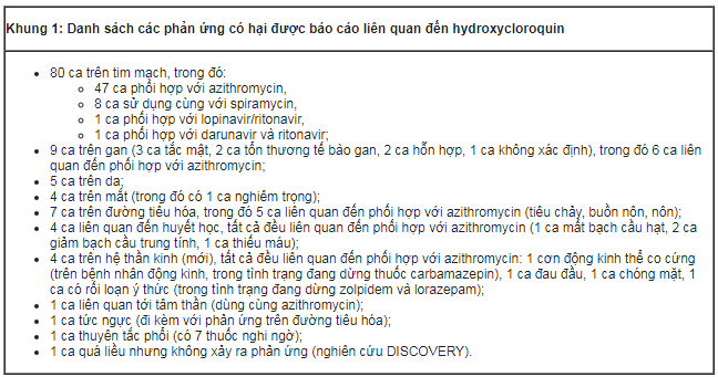 Trong các báo cáo trước đó, hydroxycloroquin chiếm phần lớn trong số các ca phản ứng có hại được báo cáo (chiếm 53%), theo sau là dạng phối hợp lopinavir/ritonavir (chiếm 42% số ca).