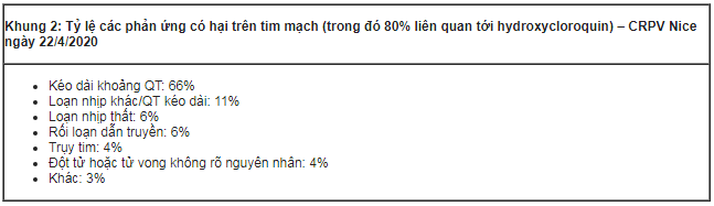 Theo báo cáo mới nhất của CRPV Nice-Alpes-Côtes d’Azur theo dõi các phản ứng có hại trên tim mạch (xem Khung 2), trên 80% số ca có liên quan tới hydroxycloroquin (dùng đơn độc hoặc phối hợp azithromycin).