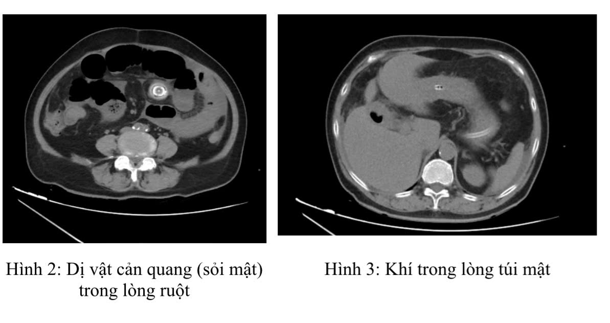 Ngay lập tức, các bác sĩ của Trung tâm Phẫu thuật Tiêu hóa đã tiến hành các thăm dò cần thiết. Kết quả X-quang bụng không chuẩn bị cho thấy dấu hiệu các quai ruột giãn hơi. Chụp cắt lớp vi tính ổ bụng (CT scan) đã xác định rõ ràng tình trạng tắc ruột. Hình ảnh CT cho thấy giãn các quai ruột non quanh rốn kích thước 36mm có mức dịch khí, vị trí chuyển tiếp có dị vật cản quang hình tròn kích thước 23mm. Đồng thời, túi mật thành dày nhẹ, chứa khí có đường thông với tá tràng. Đây chính là “bộ ba dấu hiệu Rigler” điển hình của tắc ruột do sỏi mật, bao gồm: hình ảnh khí trong đường mật (pneumobilia); tắc ruột non với mức nước-khí; và hình ảnh sỏi mật lạc chỗ trong lòng ruột.