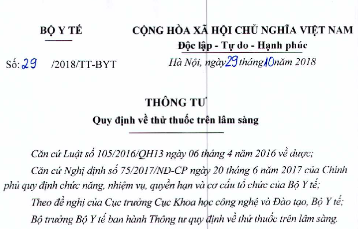 Ngày 29/10/2018, Bộ Y tế đã ban hành Thông tư số 29/2018/TT-BYT Quy định về thử thuốc trên lâm sàng, có hiệu lực thi hành từ ngày 01/01/2019. Thông tư này quy định về việc ban hành, áp dụng Thực hành tốt thử thuốc trên lâm sàng; đánh giá việc đáp ứng Thực hành tốt… Xem thêm