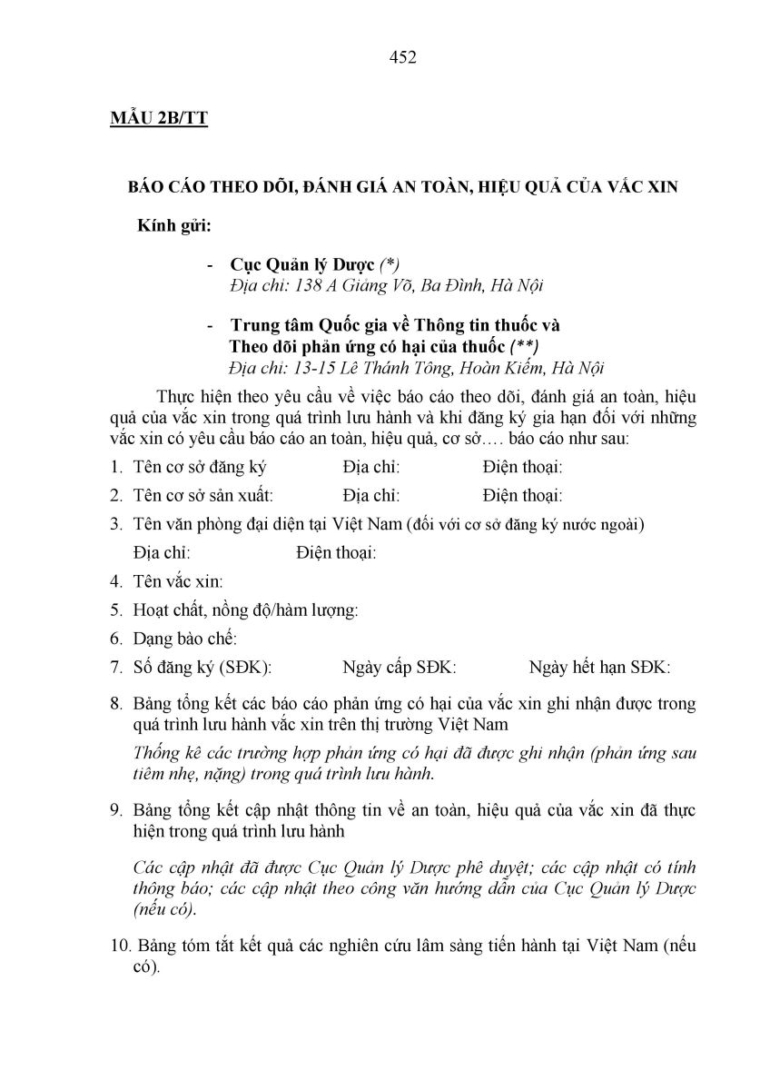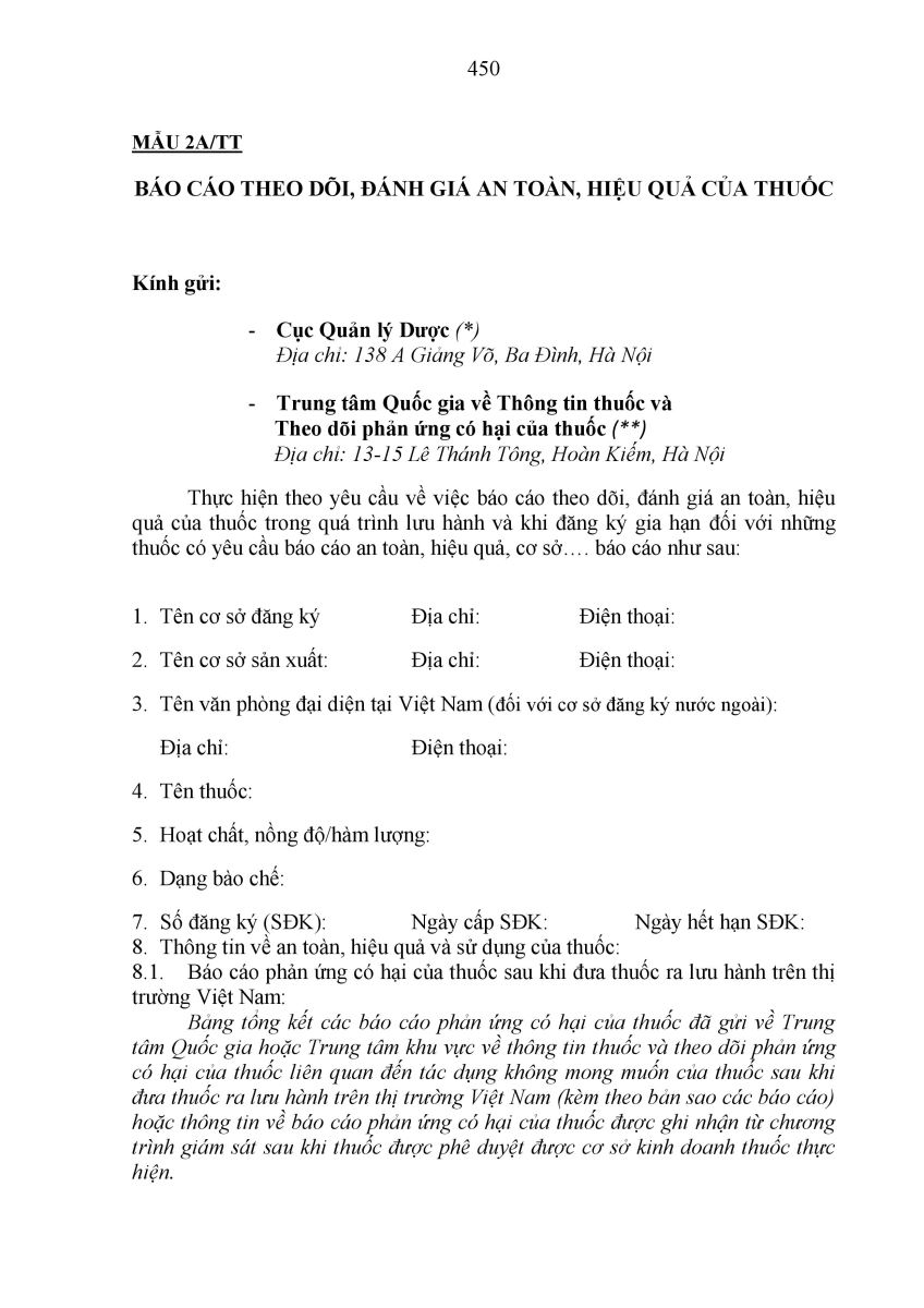 2. Cơ sở đăng ký thuốc phải báo cáo đánh giá an toàn, hiệu quả đối với thuốc quy định tại khoản 2 Điều 8 Thông tư này theo Mẫu 2A/TT (đối với thuốc)hoặc Mẫu 2B/TT (đối với vắc xin):