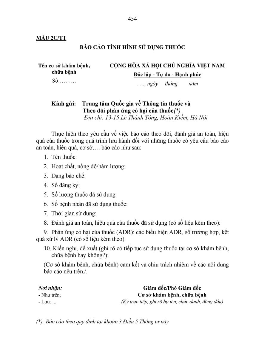 3. Cơ sở khám bệnh, chữa bệnh có sử dụng thuốc báo cáo tình hình sử dụng thuốc theo Mẫu 2C/TT (đối với thuốc) ban hành kèm theo Thông tư này định kỳ 06 tháng một lần trong thời hạn giấy đăng ký lưu hành còn hiệu lực đối với thuốc quy định tại khoản 2 Điều 8 Thông tư này và gửi về Trung tâm DI & ADR Quốc gia để tổng hợp, đánh giá và báo cáo Cục Quản lý Dược.