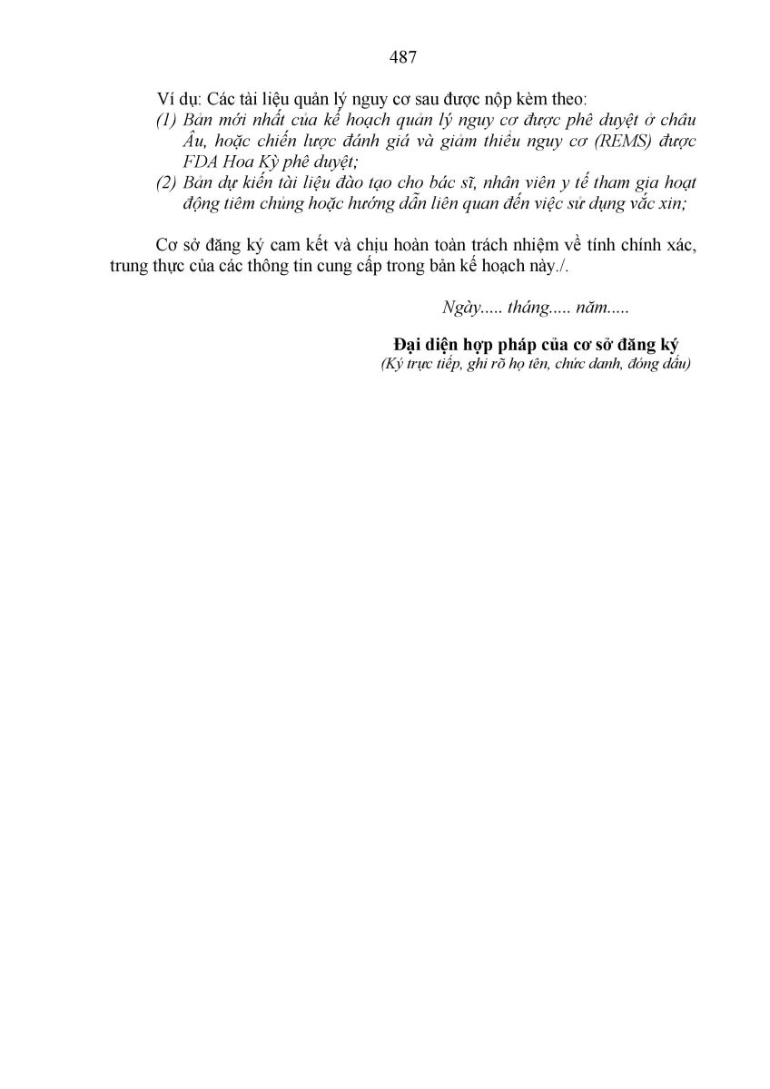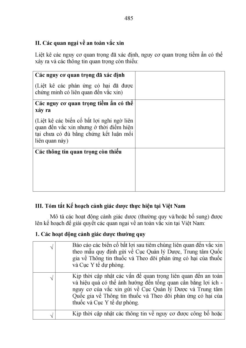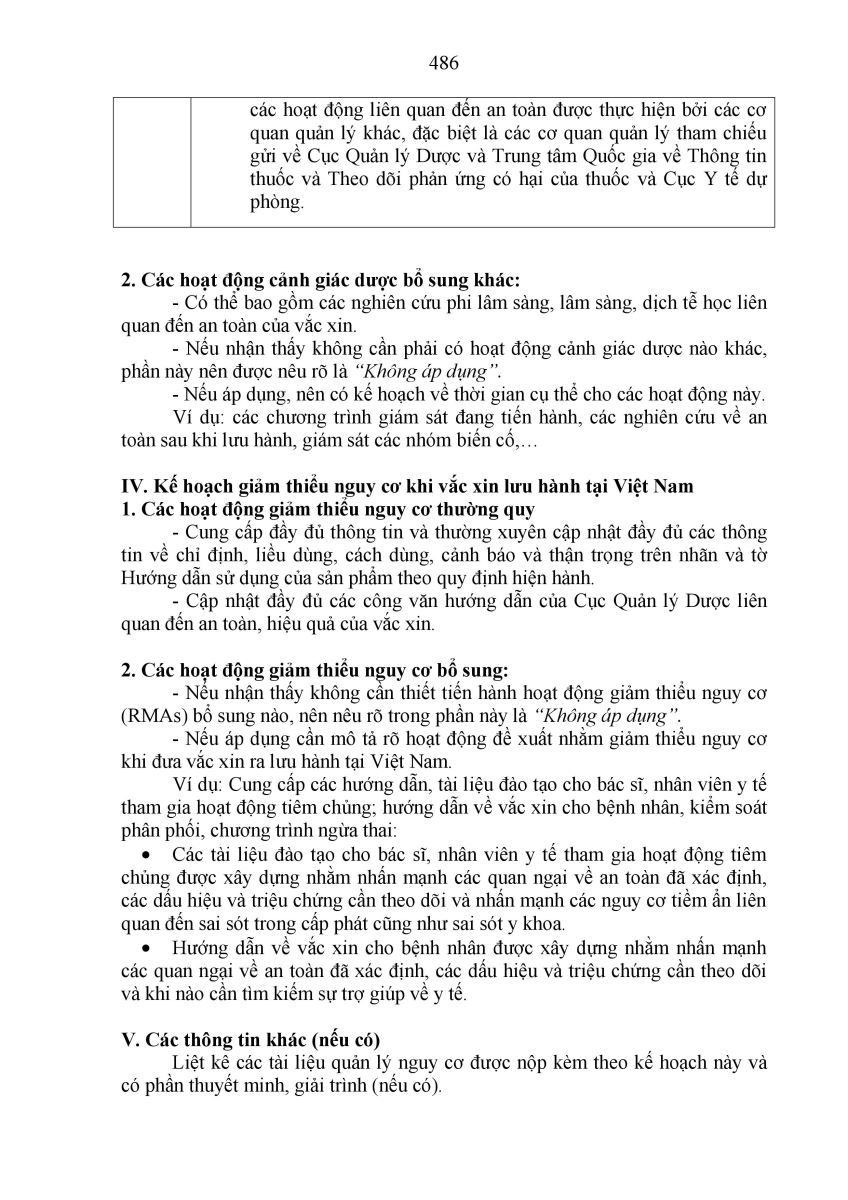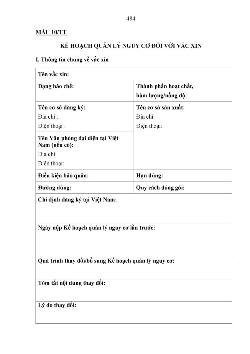 Đối với vắc xin, kế hoạch quản lý nguy cơ (Mẫu 10/TT) cũng đã được xây dựng và quy định trong Điều 24. Quy định chung về tài liệu hành chính trong hồ sơ đề nghị cấp, gia hạn, thay đổi, bổ sung giấy đăng ký lưu hành thuốc, nguyên liệu làm thuốc. Quy định này giúp tăng cường hoạt động theo dõi, giám sát tính an toàn của vắc xin, đảm bảo an toàn tối đa cho người sử dụng.