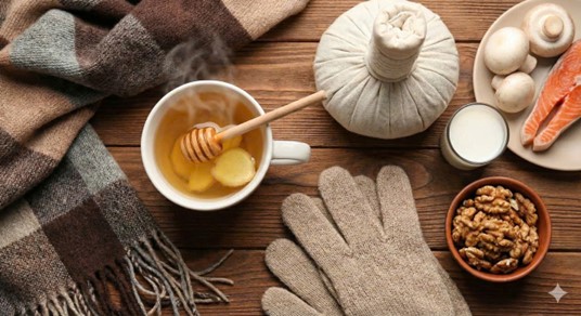 Về dinh dưỡng, mùa đông thường thiếu nắng khiến cơ thể giảm tổng hợp vitamin D và xu hướng ăn nhiều chất béo cần được điều chỉnh lại. Do đó cần tăng cường thực phẩm giàu vitamin D và canxi như: Trứng, sữa, nấm và cân nhắc bổ sung viên uống Vitamin D3 (theo chỉ định bác sĩ) để đảm bảo xương chắc khỏe; Axit béo omega-3 từ cá biển, hạt óc chó giúp kháng viêm tự nhiên, giảm bớt tình trạng cứng khớp buổi sáng; Gia vị tính ấm: Gừng, nghệ, tỏi chứa các hoạt chất giảm đau tự nhiên (như Gingerol, Curcumin). Uống đủ nước ngay cả khi không khát. Khoa học ví sụn khớp như một “miếng bọt biển” với 80% thành phần là nước. Khi cơ thể thiếu nước, sụn sẽ mất đi độ đàn hồi, trở nên khô cứng và “giòn” hơn, dẫn đến tăng ma sát và dễ nứt rách dưới sức nặng của cơ thể. Chính vì vậy, việc uống nước chủ động ngay cả khi chưa khát là yếu tố then chốt để duy trì độ giãn nở cho sụn, giúp giảm tổn thương cho xương và khớp, tăng vận động trơn tru và giảm thiểu đau nhức.