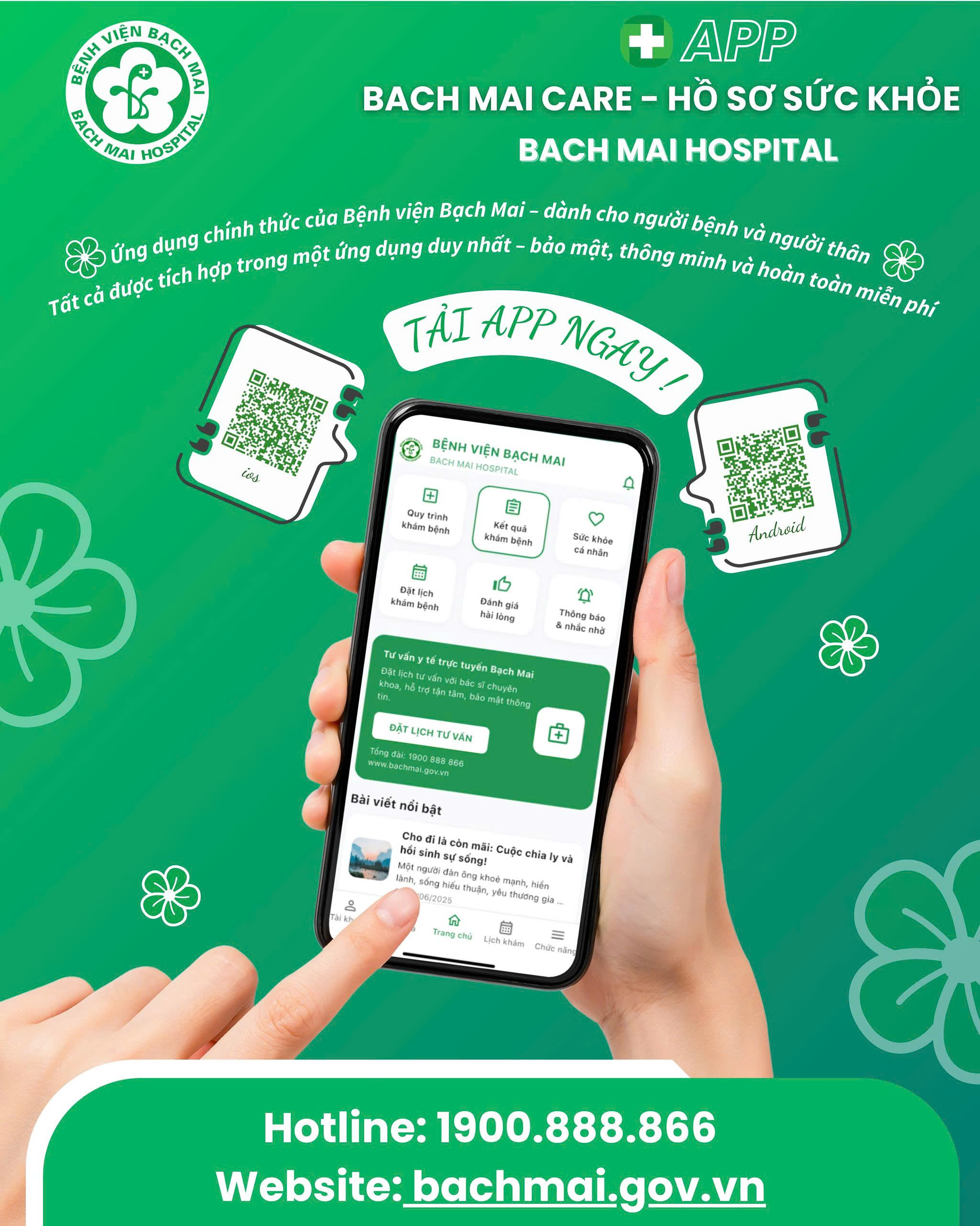 Hãy tải ứng dụng Bệnh Viện Bạch Mai để trải nghiệm các dịch vụ chăm sóc sức khỏe tiện ích và nâng cao chất lượng cuộc sống của bạn.